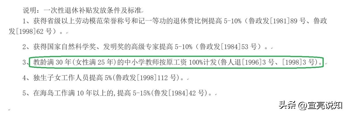 3、教龄满30年(女性满25年)的中小学教师按原工资100%计发(鲁人退[1996]3号、[1998]3号)。