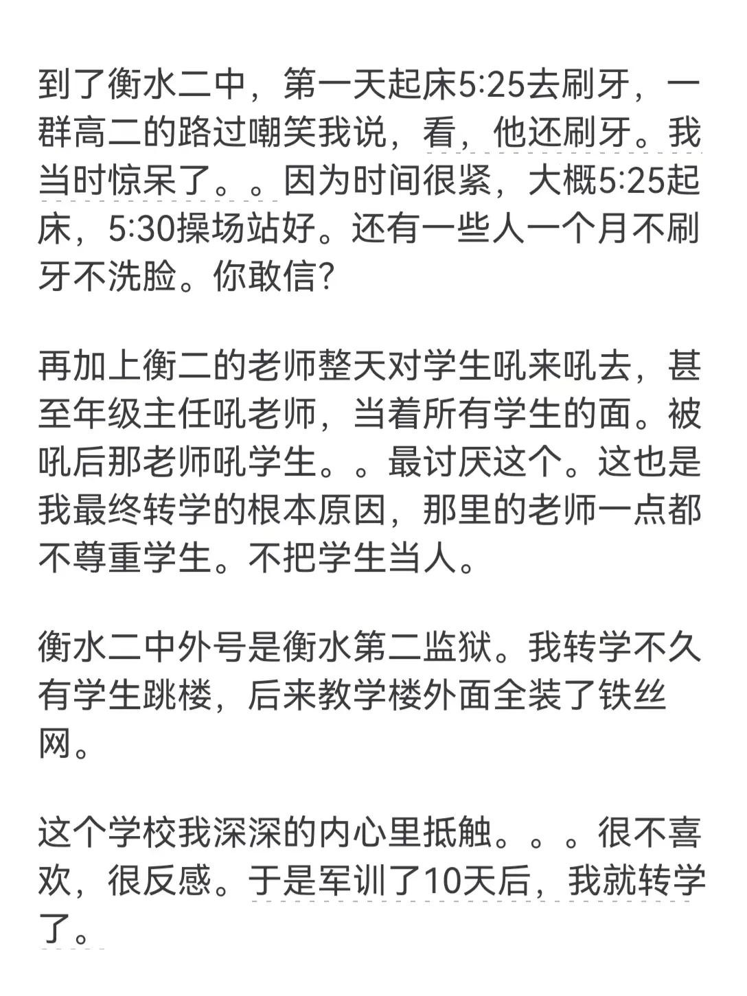 看了网友的描述,我才发现衡水中学和衡水二中并不是一个学校,我们以前说衡水中学非常严,其实不然,真实的衡水中学也没有那么严,老师也对学生不错。真正严格的是那些想要模仿衡水中学的学校,想要衡水中学高的升学率,但是却没有模仿到精髓,东施效颦,笑料百出。