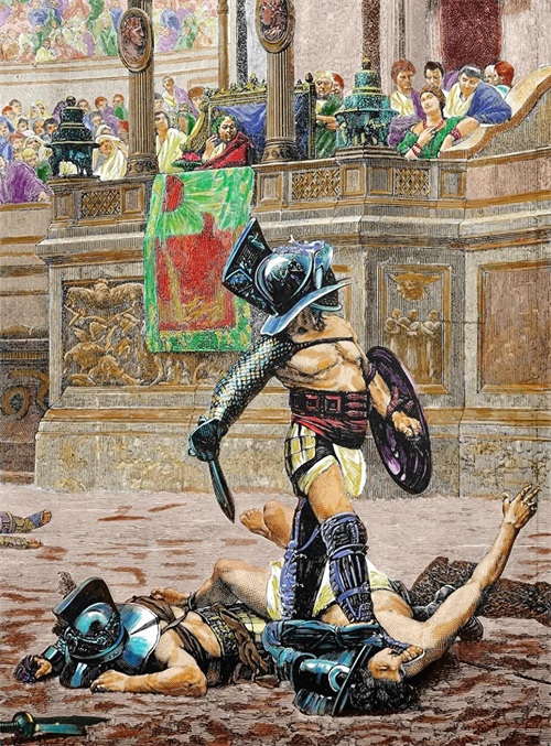 与普遍的看法相反,角斗士不一定会战斗到死。相反,战斗继续进行,直到其中一人投降,通常是举起一根手指。总的来说,只有10%到20%的角斗士在比赛中死亡——这在一定程度上反映了他们对投资者的高财务价值。