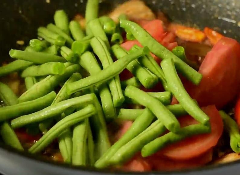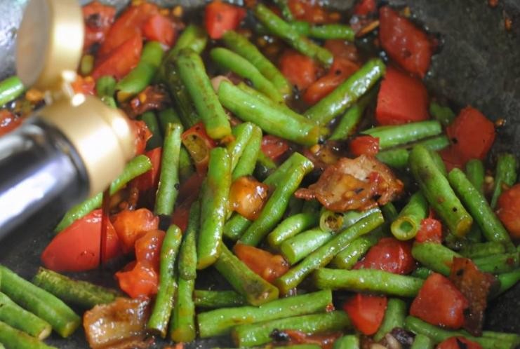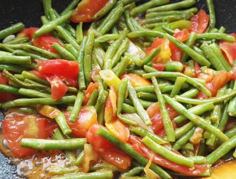 慢慢地翻炒,直到西红柿炒出浓郁的汤汁,然后倒入豆角炒匀,如果汤汁多,就可以不用加水,汤汁少的话,需要加一点清水。