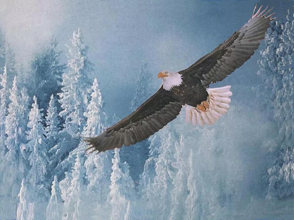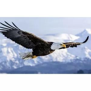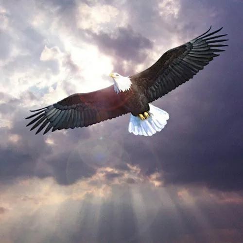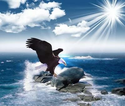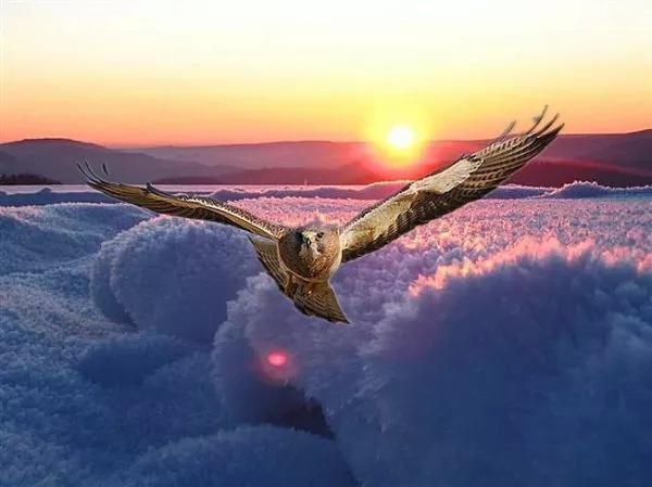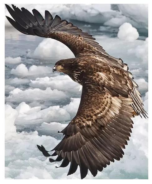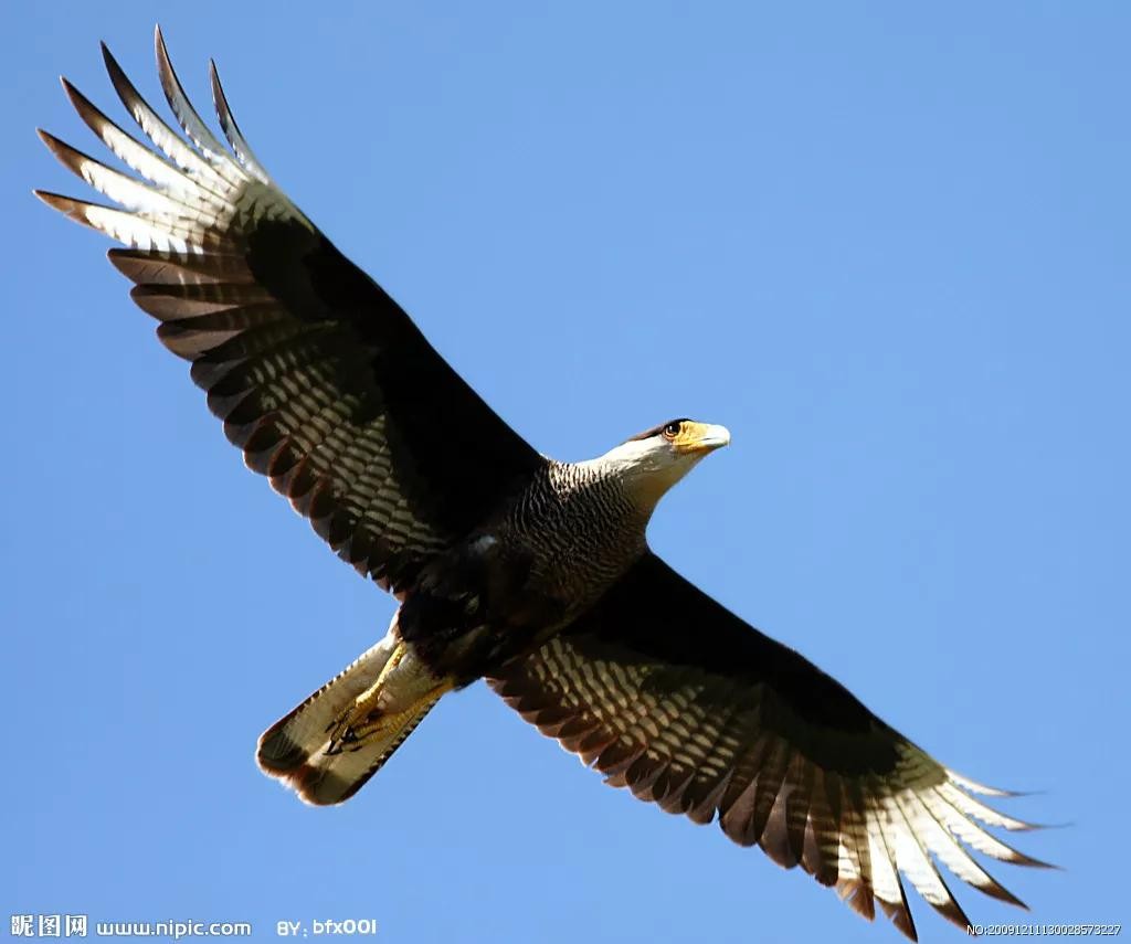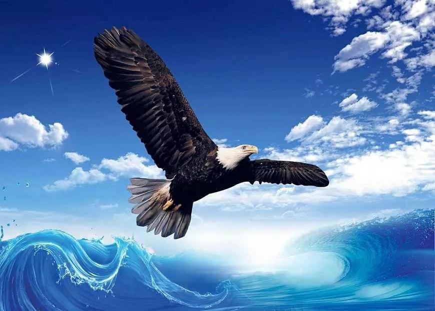 雄鹰在蓝天白云中展翅飞翔,搏击长空。