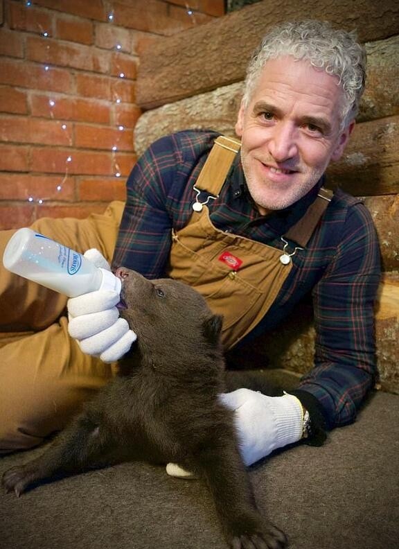 46岁的英国摄影师Gordon Buchanan在6只小灰熊5周大的时候把它们救了出来,成为了它们的“代理妈妈”,这位“奶爸”不仅给它们喂奶,还教它们爬树和觅食,以便它们日后回归森林。