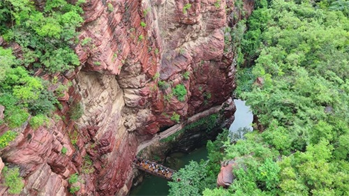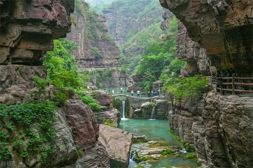 云台山主峰茱萸峰海拔1308米,四季景色各异,春天山花烂漫,夏季绿意盎然,秋季层林尽染,冬季银装素裹。其中,红石峡(温盘峪)以丹霞地貌著称,红色砂岩形成的峡谷奇观与碧水相映成趣,美不胜收。潭瀑峡(小寨沟)、泉瀑峡(老潭沟)等景点则展现了瀑布群落的壮观景象,亚洲落差最大的云台天瀑便坐落在这里,落差达314米,如白练悬空,气势磅礴。