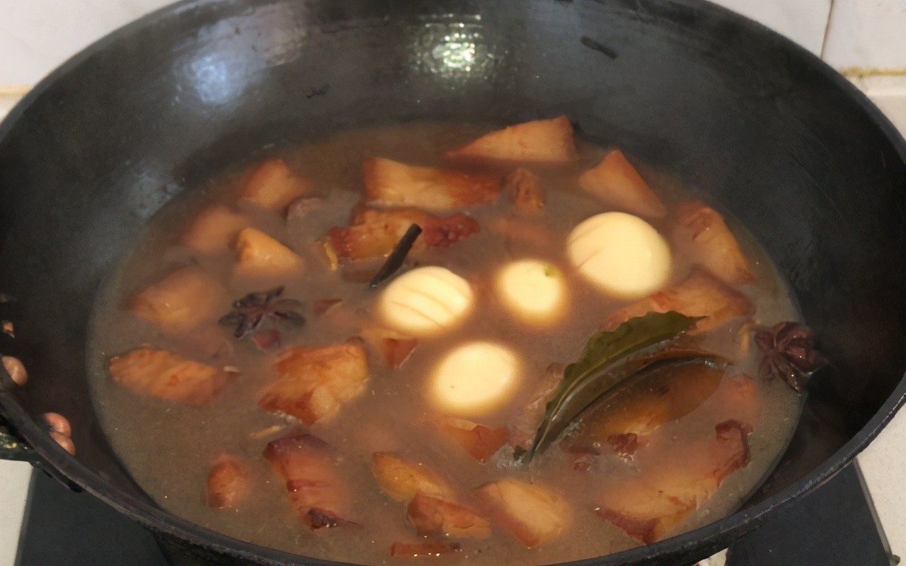 第六步:往锅中加入开水,再加入桂皮、八角、香叶、陈皮、山楂干等香料;再把预先煮好的鸡蛋打上花刀,一起放入锅中慢炖半个小时左右;炖好后开盖,再加入适量盐和鸡精调味,最后关火备用。