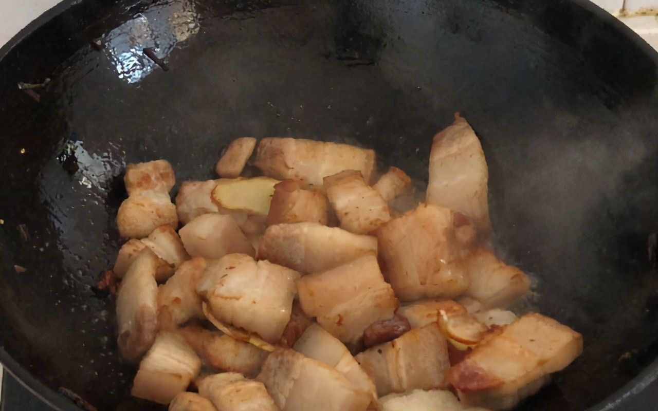 第四步:锅烧热加入适量食用油,再放入葱、姜,小火炒香后把肉加进来,用中火翻炒,炒出肥肉中的肥油(我这次用的五花肉偏肥,盛出一部分油出来炒青菜很不错);然后往锅中加入适量料酒去腥。