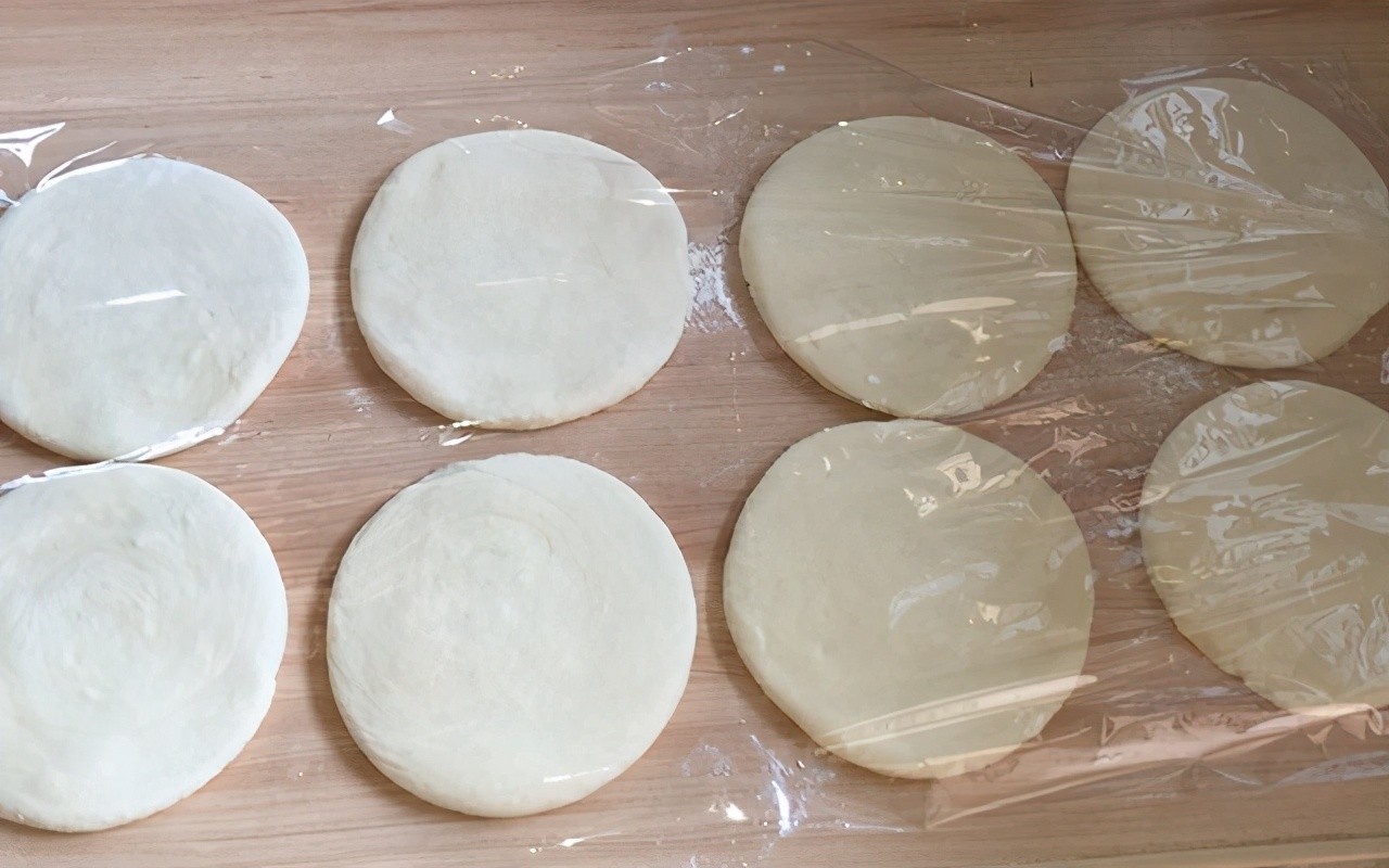 第八步:取第一个揉好的剂子在手心搓条,一端可以搓得尖一些;接着用擀面杖擀成椭圆形;然后卷起,把细的尾巴收好在剂子底端并按扁;都擀成饼状后,盖上保鲜膜,二次醒发10分钟左右。