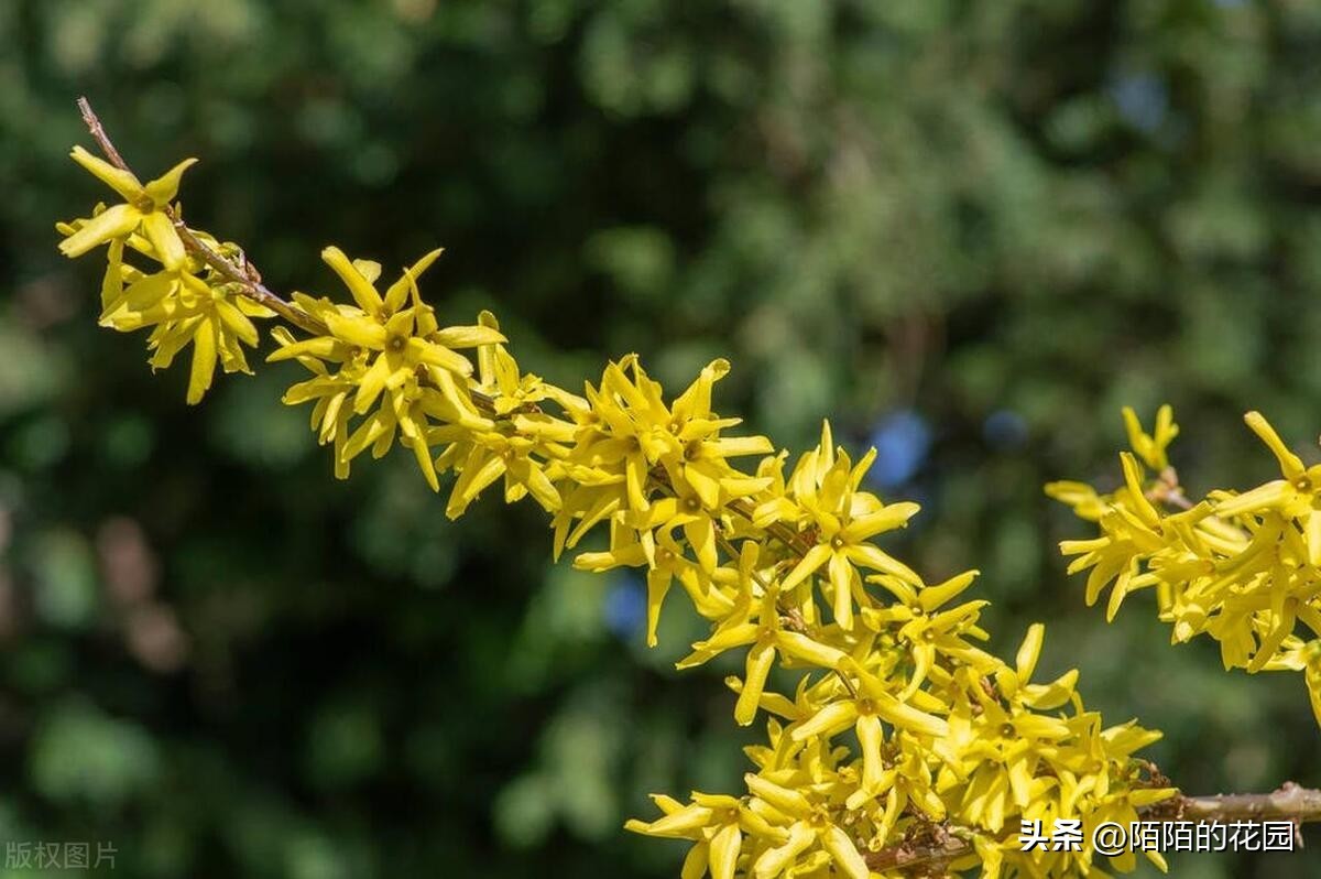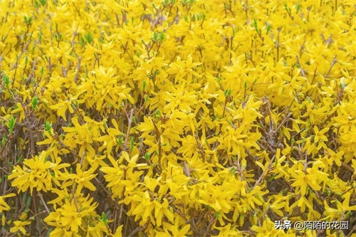 寸寸金是连翘的俗称,也叫金条花,属于落叶灌木,花期3—4月,花呈现金黄色,属于先开花后长叶的植物,初春时节,它的每一个枝条密密麻麻挂满金黄色的小花,远看很像一片片小金条。它喜温暖湿润、阳光充足的气候,耐寒力强,是一种皮实耐养的花卉,非常适合庭院种植。