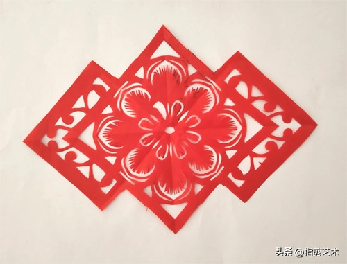 方阵团花剪纸又称为方正团花剪纸,是有三个紧密相连“正方形”,将团花“镶嵌”在其中,以正方形为主,两边则是对称团花, 它象征着和谐、美满和吉祥。