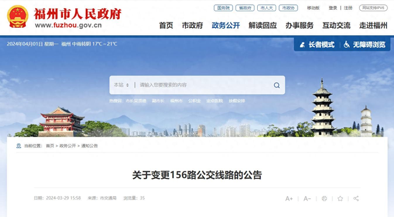 出行注意!4月8日起,福州156路公交线路有调整