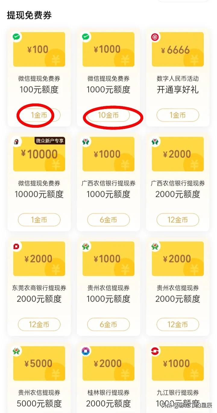 1金币可以兑换100元,10金币兑换1000元。有些是银行提现券,5000元额度。