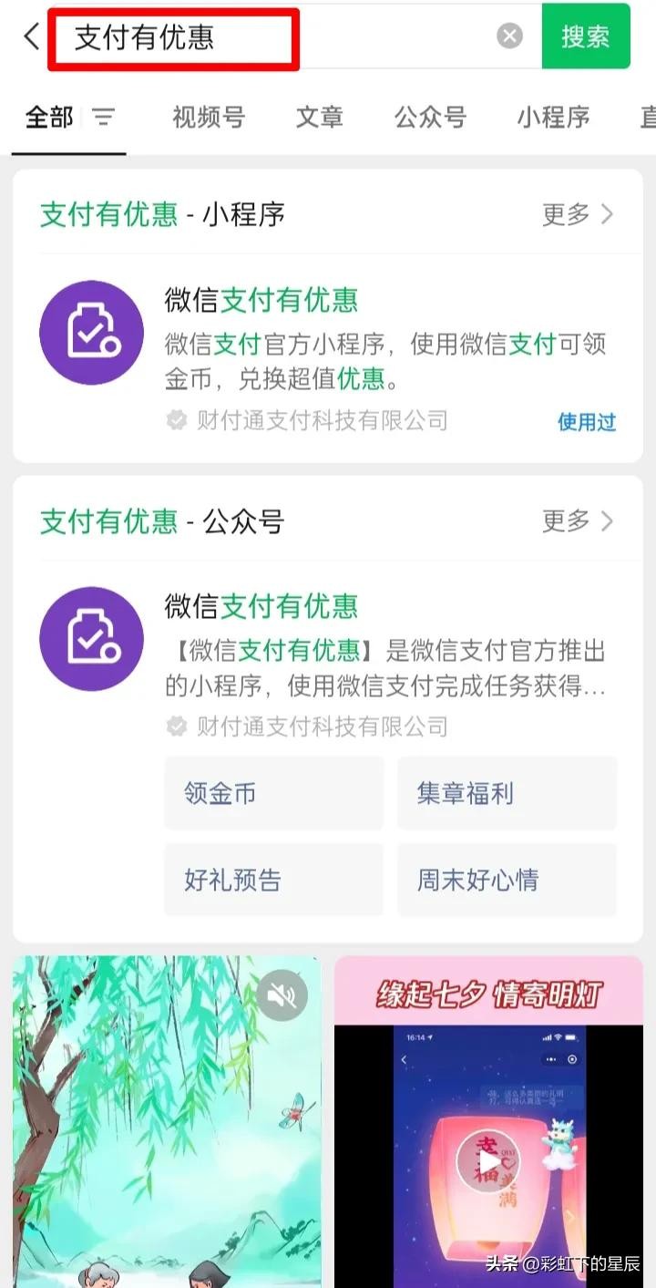 第一步 打开微信APP 在搜索页面输入 支付有优惠