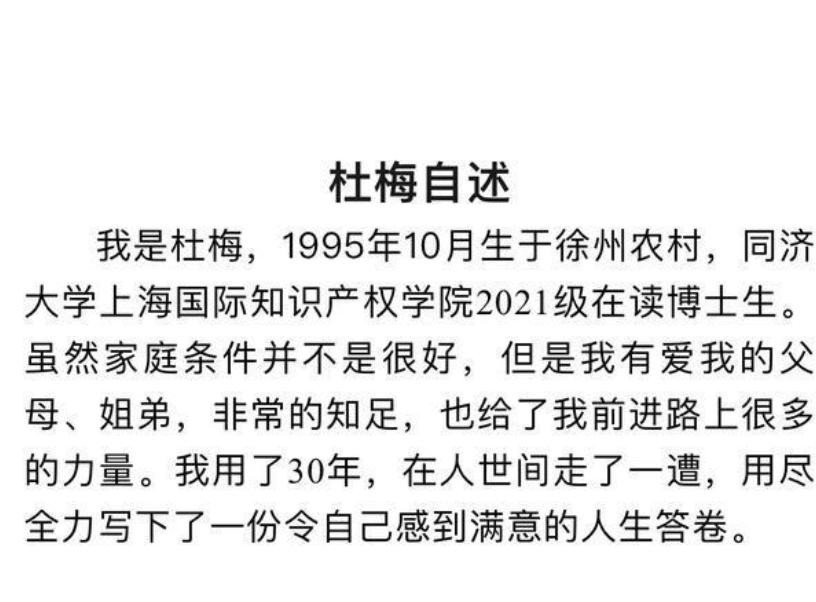 杜梅在和病魔斗争的时候,写了遗书。她在遗书里回忆自己从徐州农村一路努力,考上同济大学博士的日子,那些熬夜学习、为学术难题发愁的场景,就像昨天刚发生一样。她还说自己一直想站在大学讲台上,把知识传授给更多人,想用自己的所学为社会做点贡献。