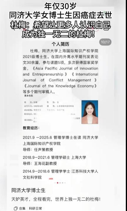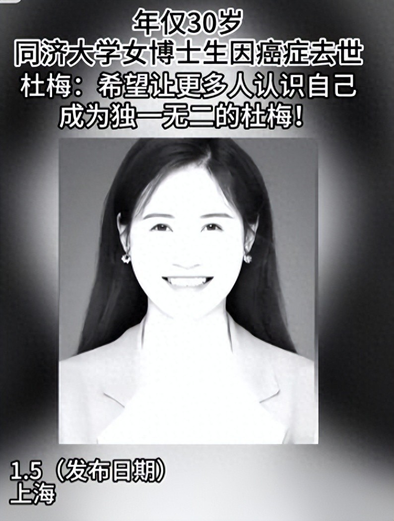 最近,网上一则消息,看得人心里特别不是滋味。2025 年 1 月 3 日 21 时 58 分,同济大学 30 岁的女博士杜梅,因为十二指肠恶性肿瘤,永远地离开了。这消息一传开,好多人都揪心不已,大家都在说,这个从穷苦家庭一路苦学出来的姑娘,咋就被病魔这么无情地带走了呢?