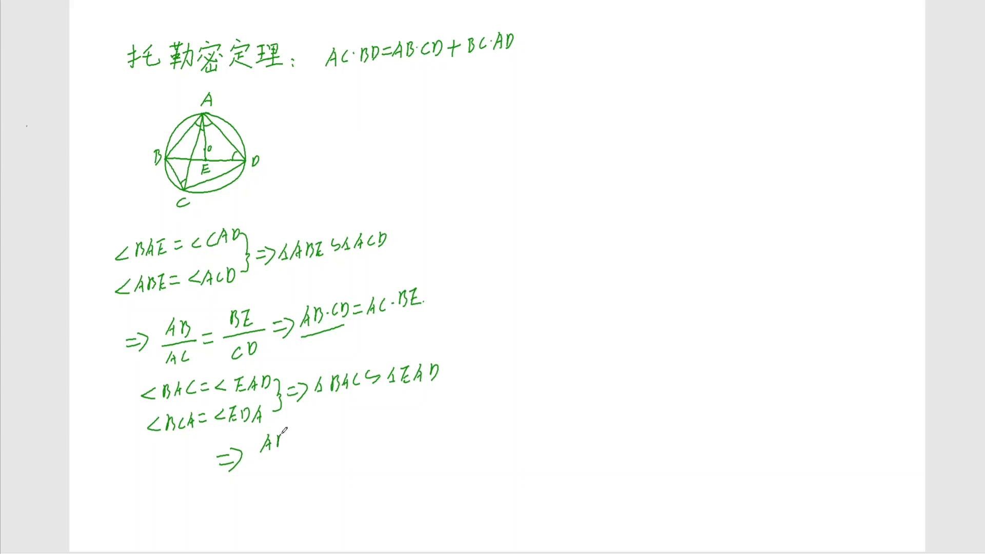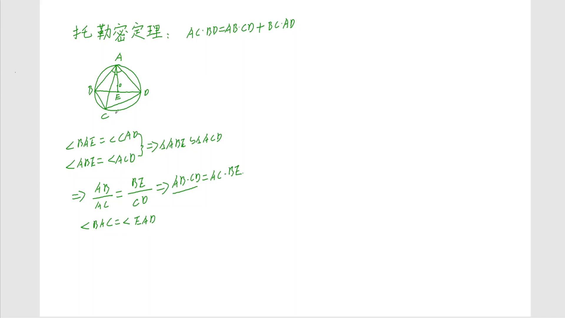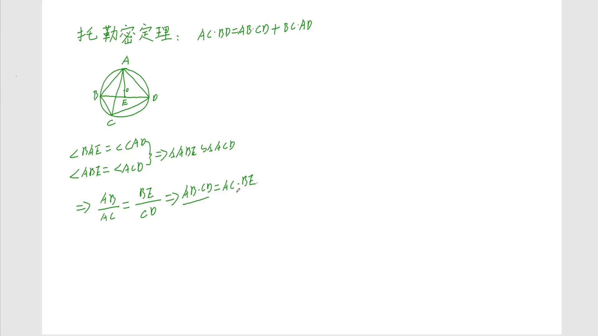 这个b e暂时不知道,先写,通过这个相似可以得出ab乘以cd等于ac乘b,这是一个结论是吧?同理大家去观察一下,再凑一个bc乘ad,看怎么凑?大家观察一下,再看这个三角形,看三角形abc这个三角形跟谁?b a c这个三角形跟哪个?跟这个e a d这个三角形,看看像e a d,e a d看相不相等?