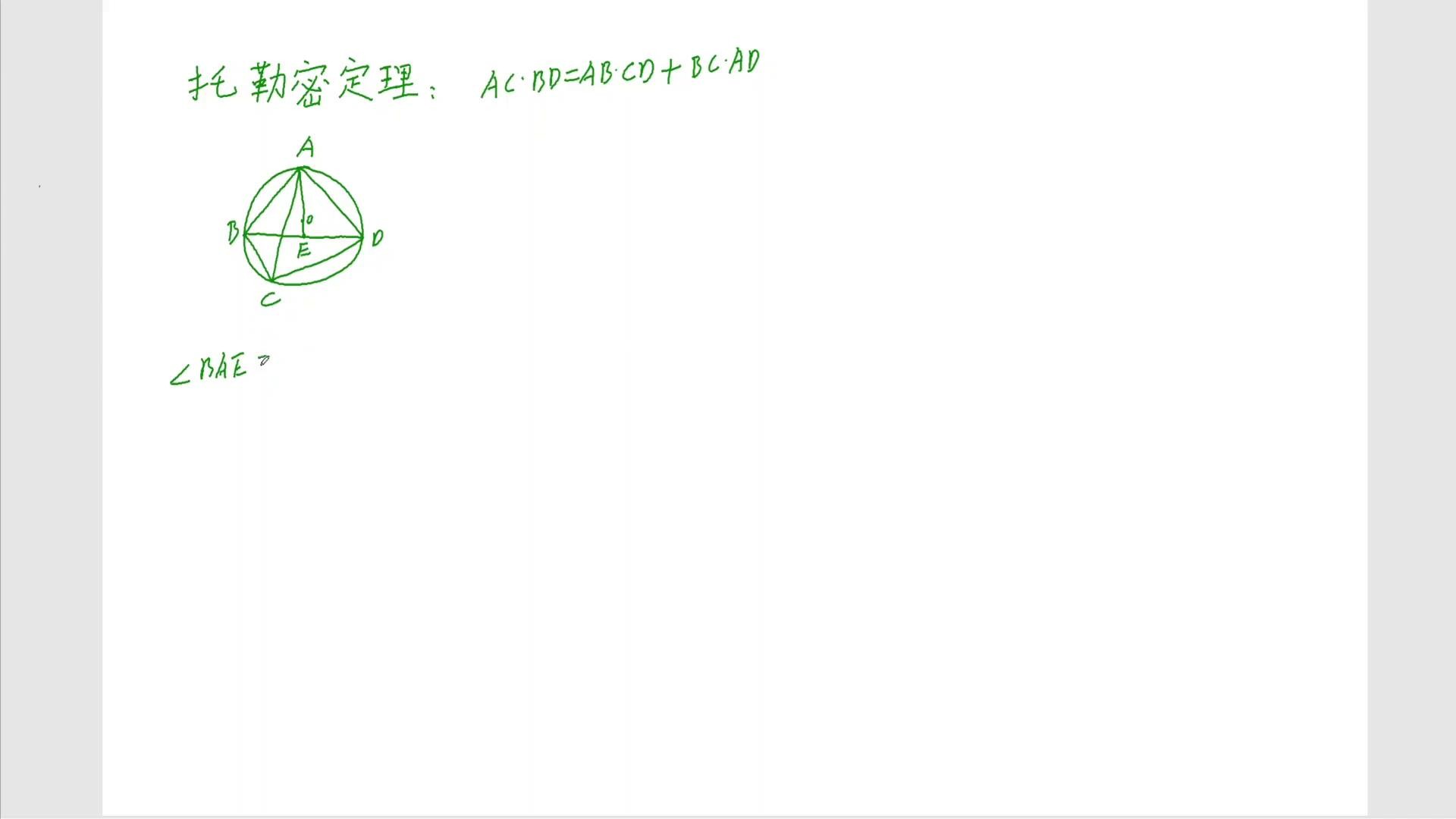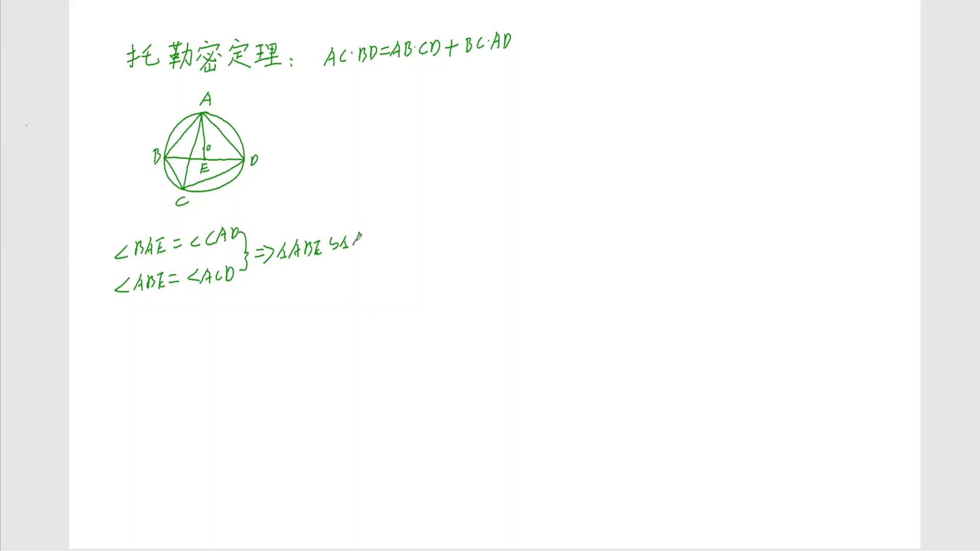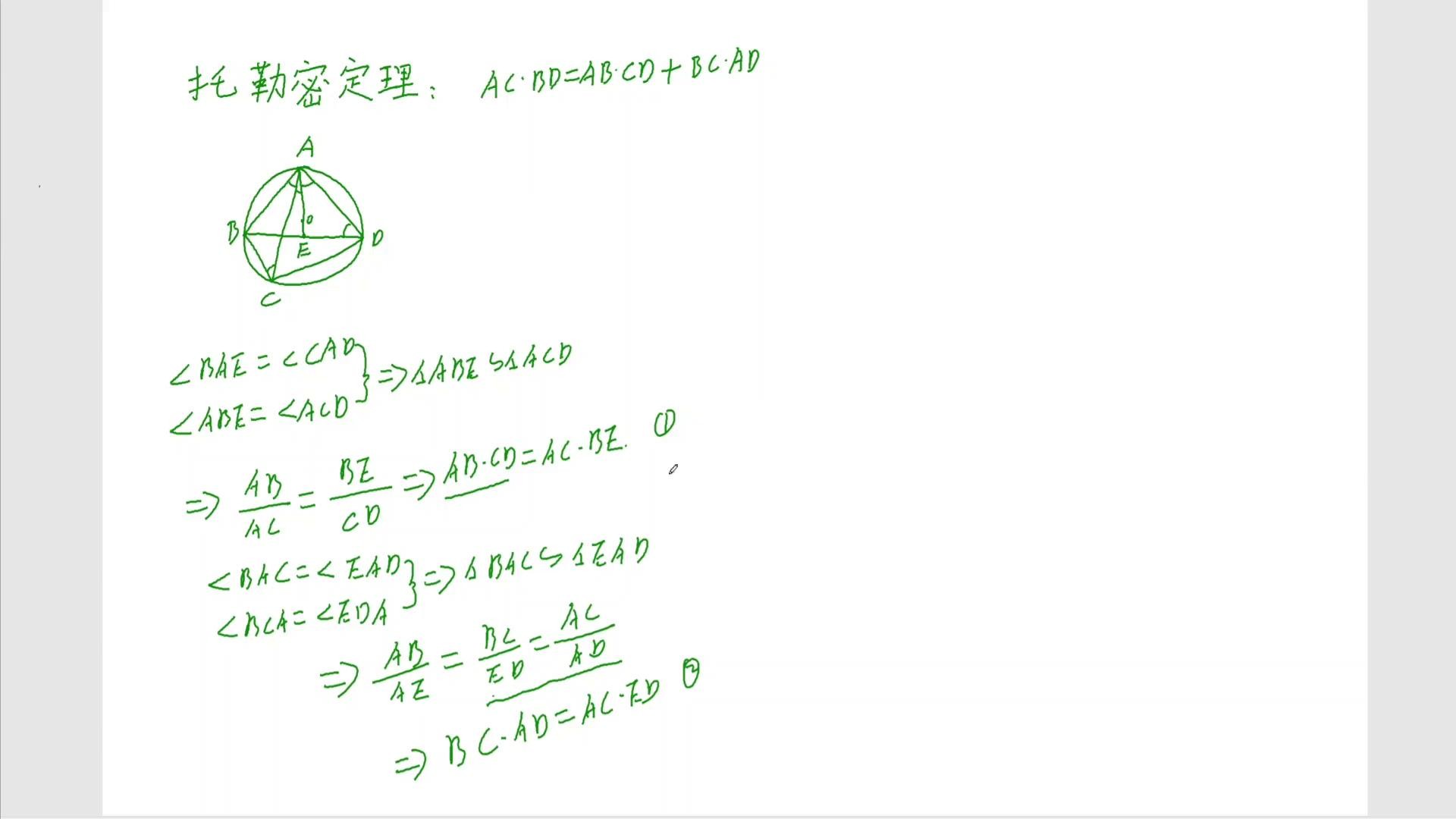 这个b e暂时不知道,先写,通过这个相似可以得出ab乘以cd等于ac乘b,这是一个结论是吧?同理大家去观察一下,再凑一个bc乘ad,看怎么凑?大家观察一下,再看这个三角形,看三角形abc这个三角形跟谁?b a c这个三角形跟哪个?跟这个e a d这个三角形,看看像e a d,e a d看相不相等?