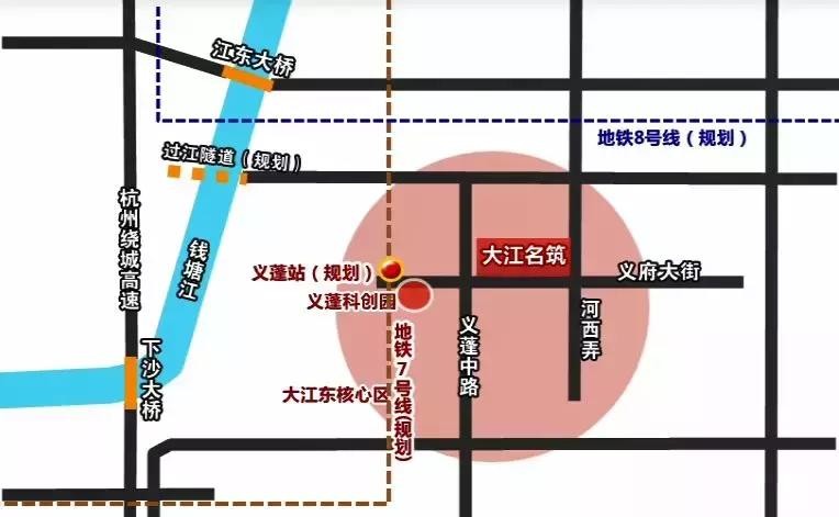 滨江春盛·大江名筑地处大江东核心居住区,距离规划中的地铁7号线义蓬站约700米。地铁和艮山东路过江隧道的加持,让这片区域和杭州主城区的距离大大缩短。