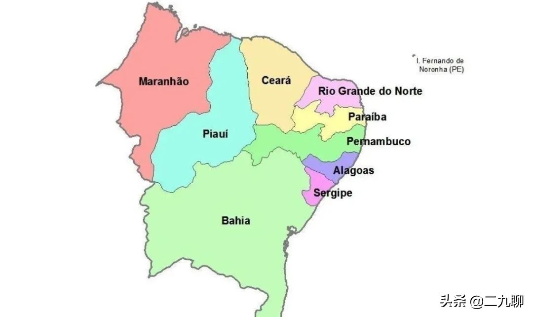 东北地区「Região Nordeste」,由阿拉戈斯州「Estados de Alagoas」,巴伊亚州「Estados da Bahia」,塞阿拉州「Estados do Ceará」,马拉尼昂州「Estados do Maranhão」,帕拉伊巴州「Estados da Paraíba」,伯南布哥州「Estados de Pernambuco」,皮奥伊州「Estados do Piauí」,北里奥格兰德州「Estados do Rio Grande do Norte,又译为北大河州」和塞尔希培州「Estados de Sergipe」,一共九个州组成,总面积为155万平方公里,约占巴西领土的18.25%。但这里拥有的国内生产总值位居巴西境内第三,总人口超过5000万。
