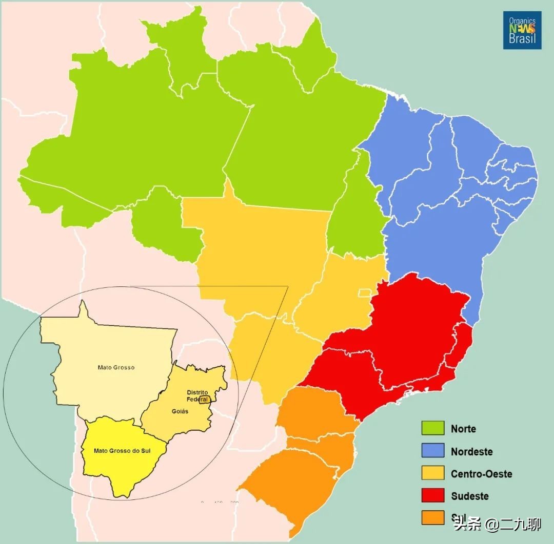 巴西区域地图,黄蓝绿红紫分别对应中西,东北,东部,东南和南部地区。