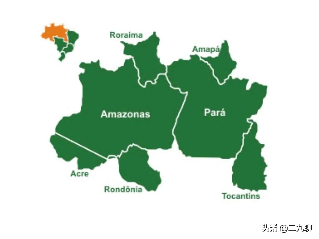 北部地区「Região Norte」,由阿克雷州「Estado do Acre」,阿马帕州「Estado do Amapá」,亚马孙州「Estados do Amazonas」,帕拉州「Estados do Pará」,朗多尼亚州「Estados de Rondônia」,罗赖马州「Estados de Roraima」和托坎廷斯「Estados do Tocantins」,一共7个州组成,总面积385万平方公里,是巴西面积最大的地区,约占巴西领土的45.26%,却仅有1630万居民。