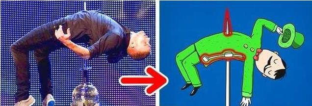 揭秘:在魔术师坐的平台上有一个看不见的枢轴,当鞋子连接在上面时,腿就可以被固定,同时裤子中还藏著一个隐形的椅子框架。