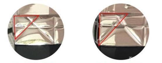 9.再看管体的银色花纹部分,正品的斜边知道三分之二处,假货则一直延续到底部, 还有就是正品的线条都比较明显, 每天线交叉都是一个正三角形, 且三角形适中,假货三角形可能不正或者太大太小。