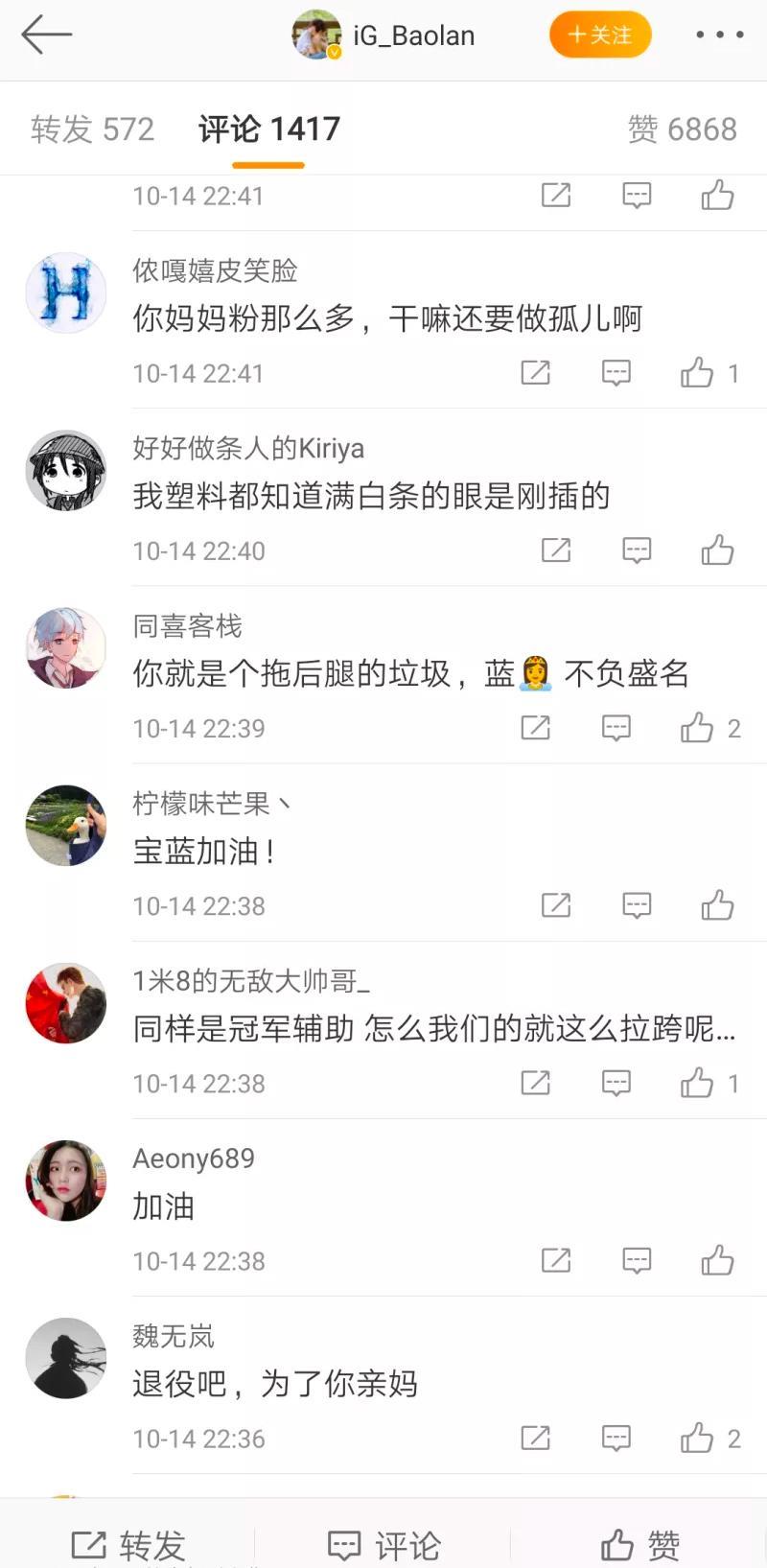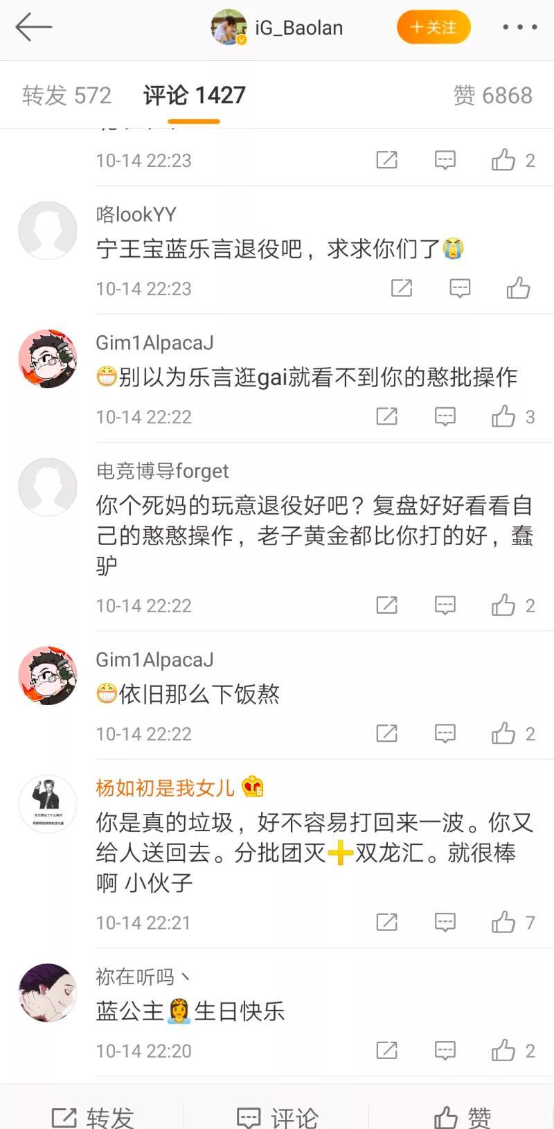 然而被吐槽的不只是打野乐言,今天IG辅助宝蓝的表现似乎也引发了大量粉丝的不满,这不在今天的比赛结束后不久,就有网友发现宝蓝的微博遭到了大量玩家的爆破,这些人除了吐槽宝蓝表现差之外,还有的人对宝蓝进行了人身攻击,有的甚至还扬言希望宝蓝退役不要在拖累IG。